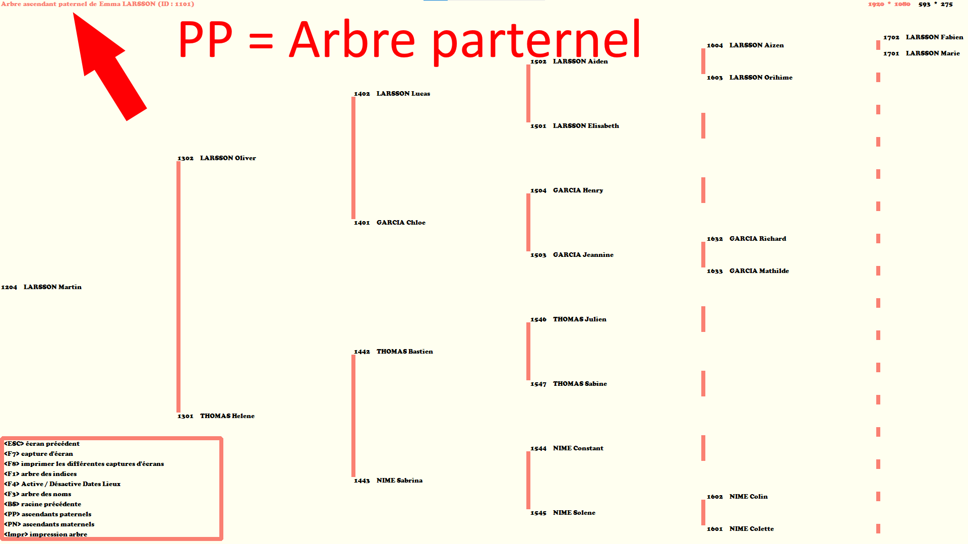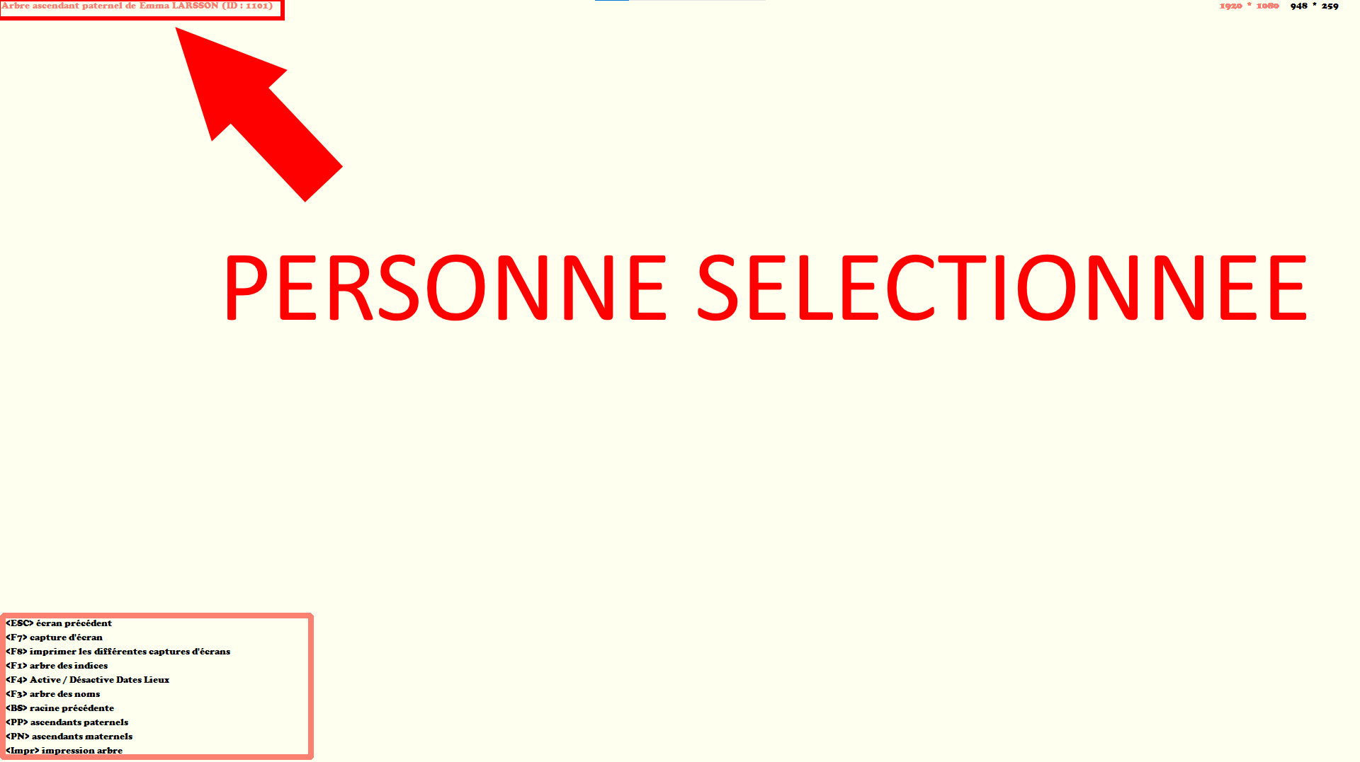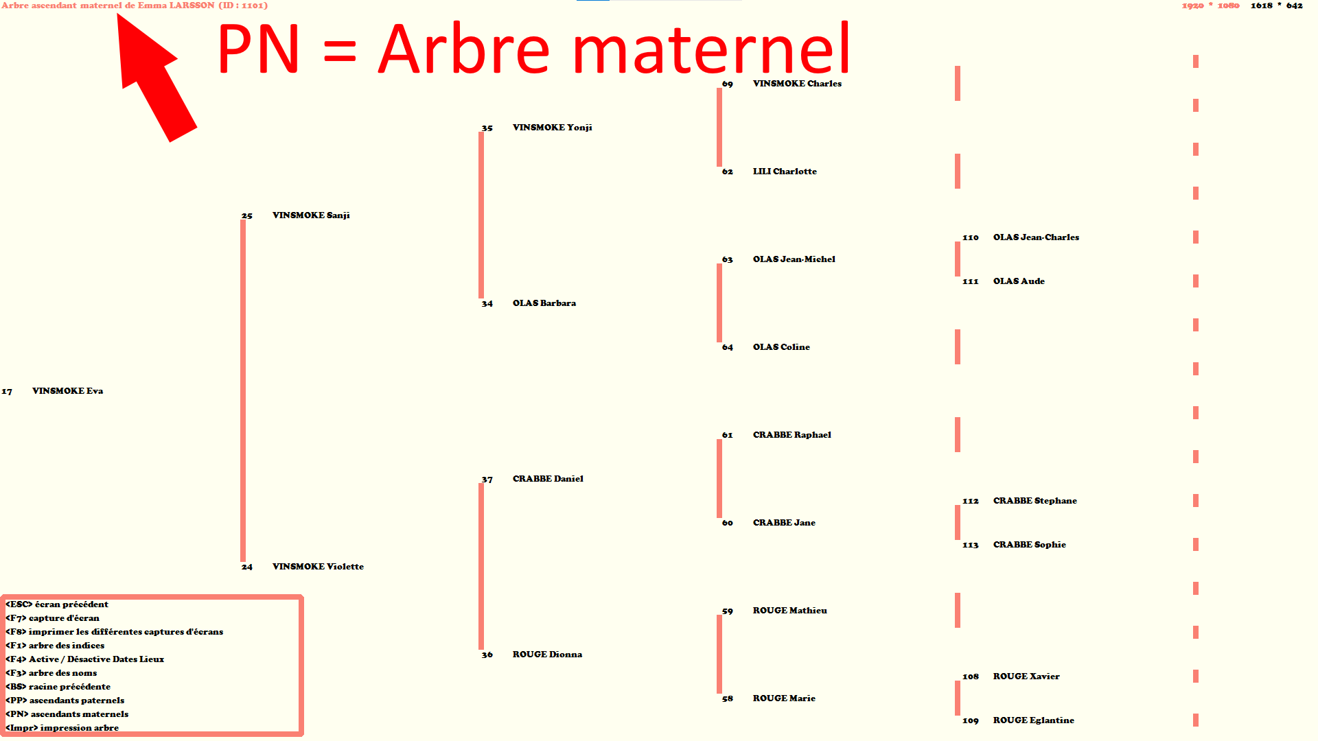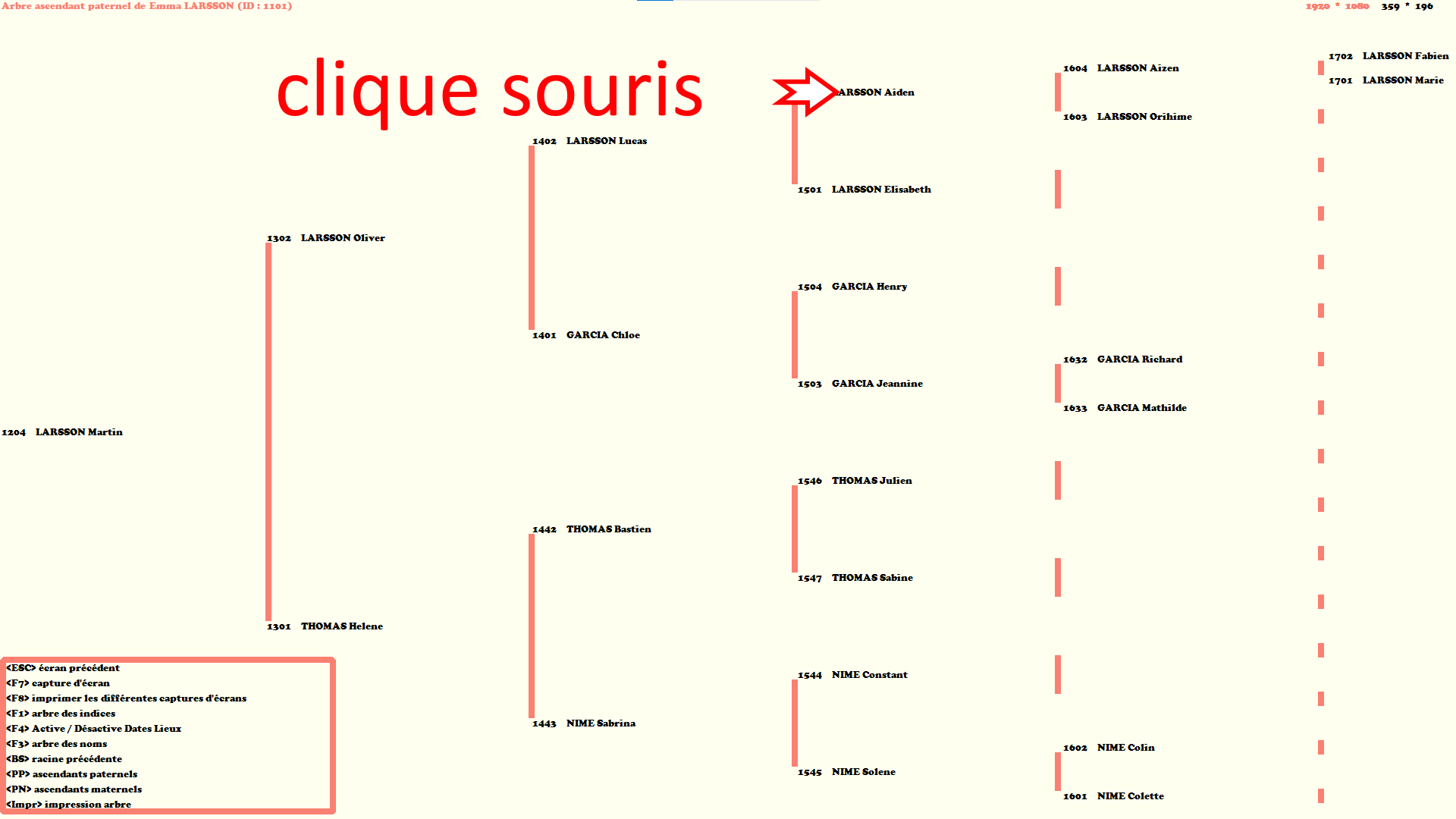 - Possibilité de se déplacer dans l'arbre de plusieur façons (touche page down affiche le coté maternelle, page up affiche le coté paternel) cliquer sur une personne permet d'accéder à son arbre