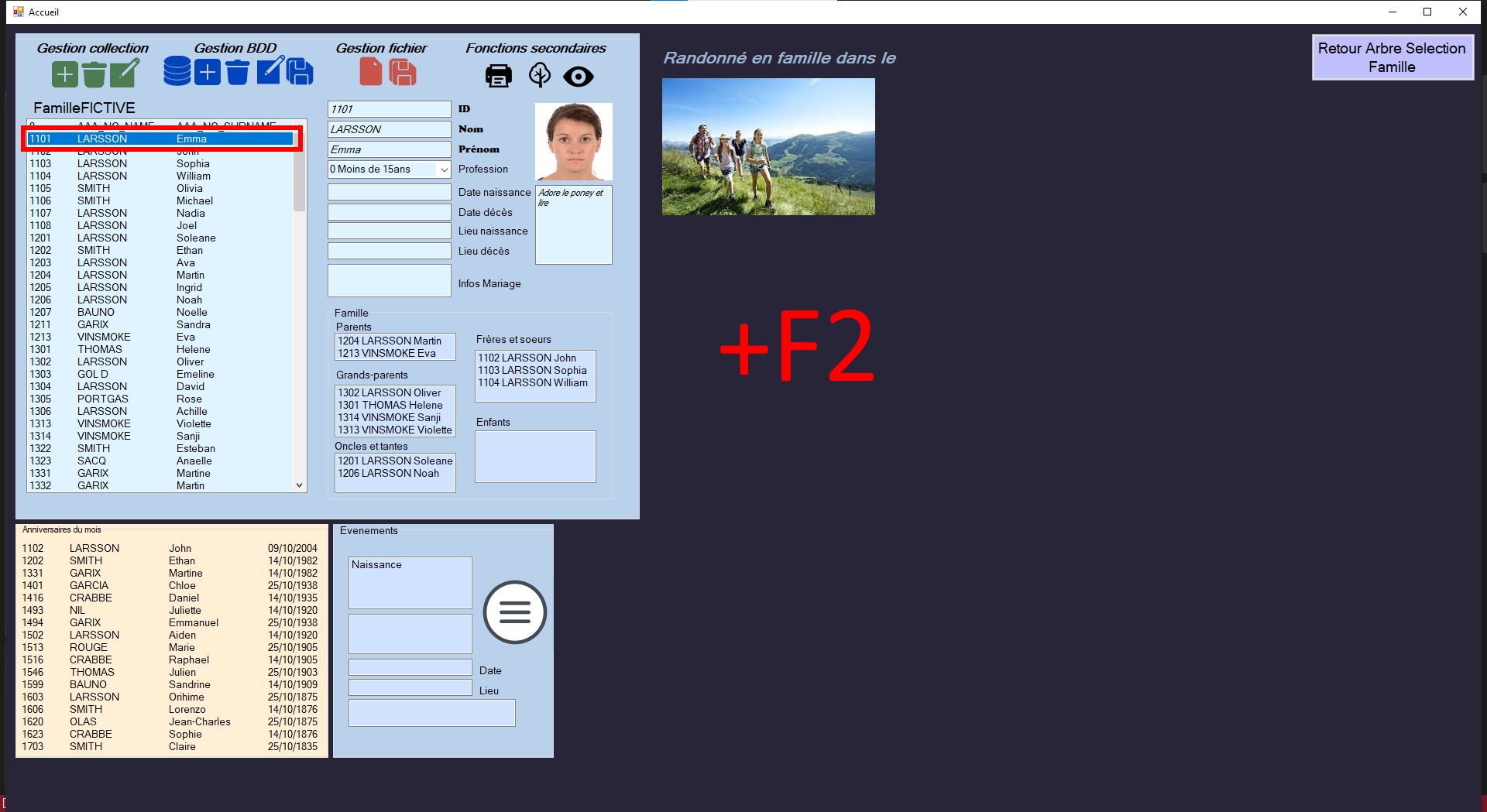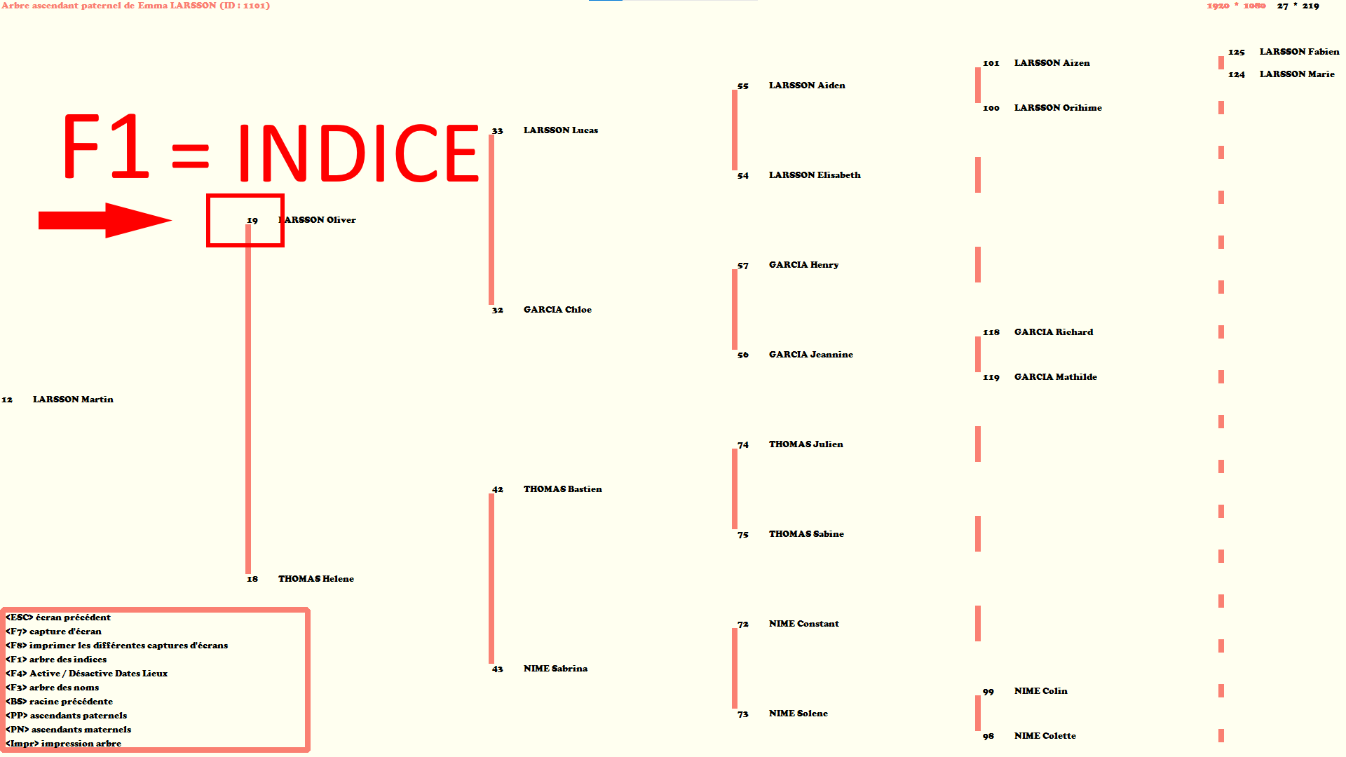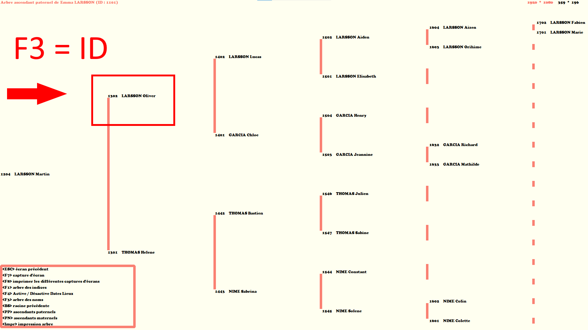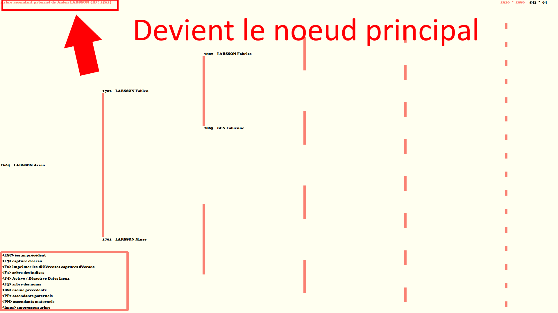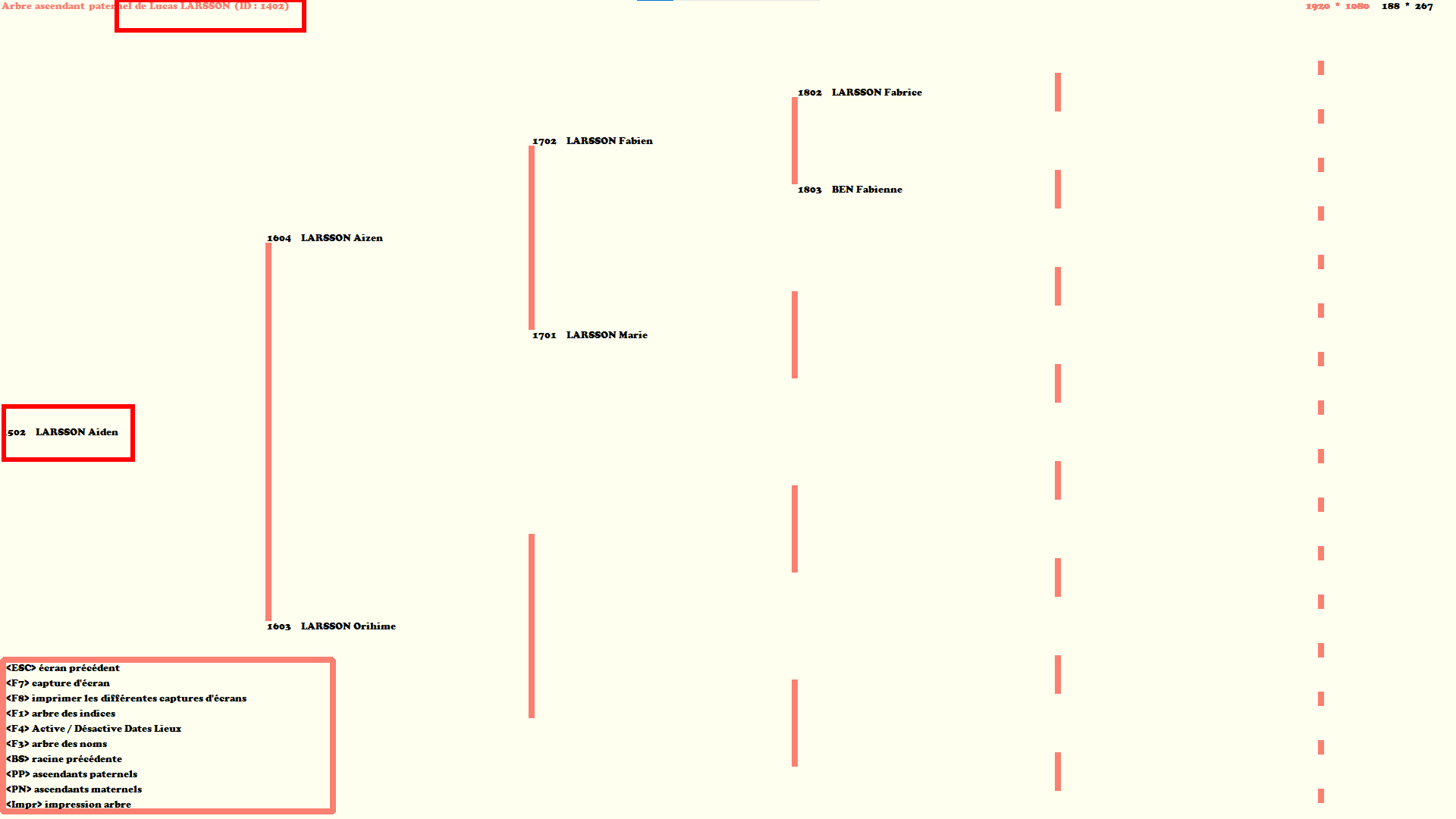 - Possibilité de se déplacer dans l'arbre de plusieur façons (touche page down affiche le coté maternelle, page up affiche le coté paternel) cliquer sur une personne permet d'accéder à son arbre