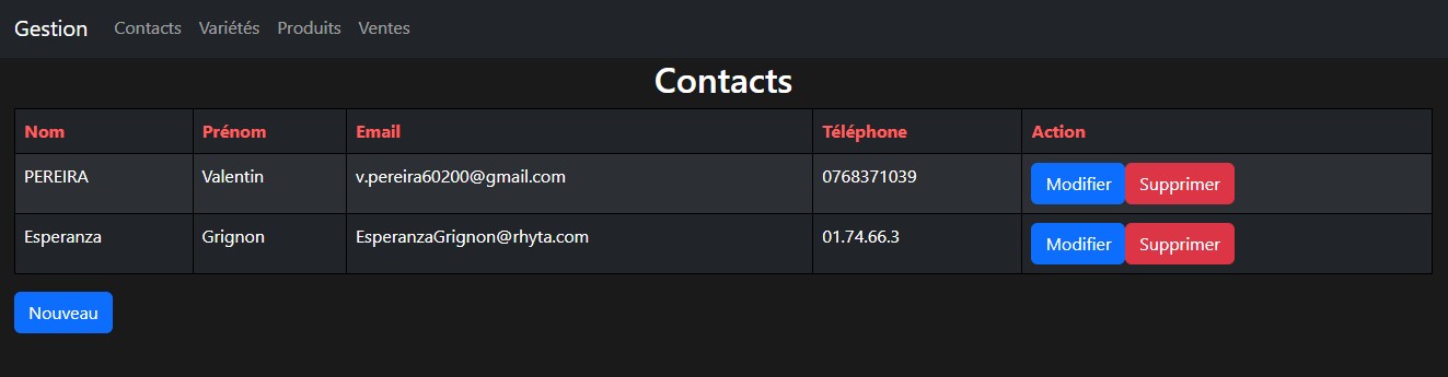 - la troisième répertorie les différents produits, nom, la variété, son poid, le stock de ce produit, ainsi que son prix.