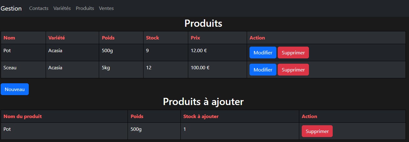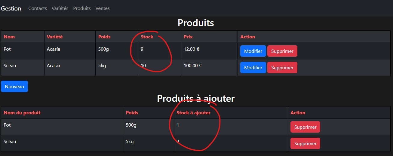 - De plus, lorsqu'une vente est effectuée, le stock du produit vendu est soustrait en fonction du nombre de vente de cette objet, suite à ça un tableau apparait avec le nom et le nombre de produits à rajouter dans le stock