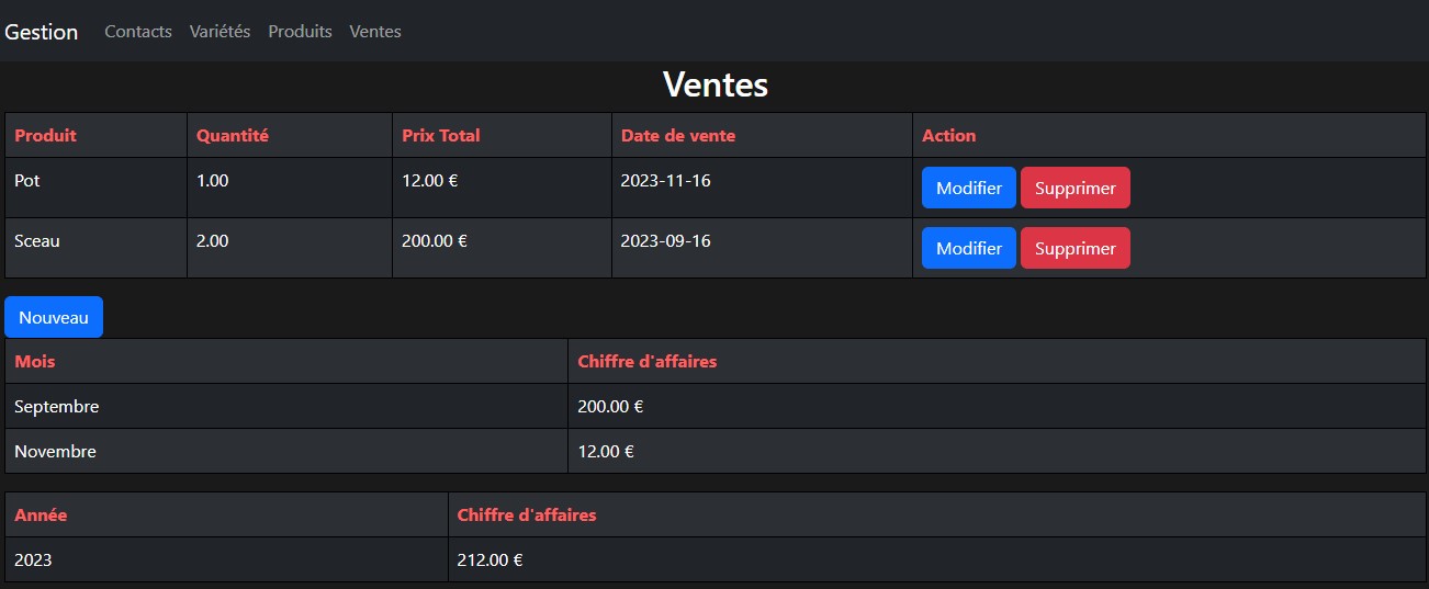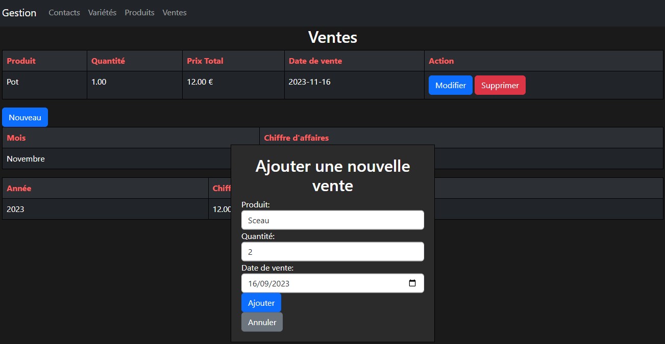 - Le dernier répertorie ses ventes, les ventes au fur et à mesure qu'elles sont ajoutées ou supprimées cela modifie le chiffre d'affaire mensuel et annuel.